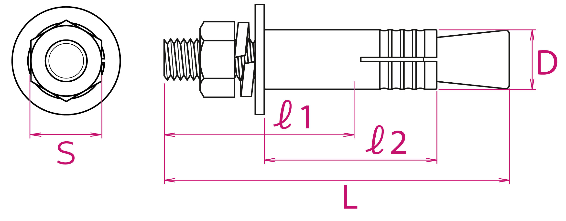 | ねじの呼び | 品番 | アンカー外径 D | 全長 L | ねじ長さ ℓ1 | スリーブ長さ ℓ2 | 最大 取付物厚 | 穿孔径 | アンカー 埋込み長さ | 穿孔深さ | ナット二面幅 S | 入数 | 標準価格 (税抜き) | |