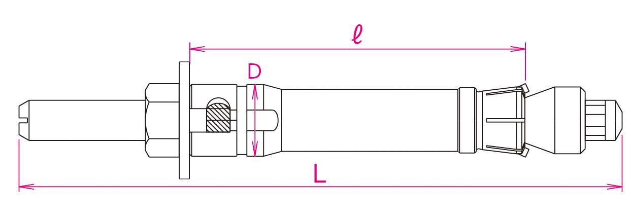 | ねじの呼び | 品 番 | アンカー外径 D | 全長 L | スリーブ長さ ℓ | アンカー 有効埋込み 長さ※1 | 最大 取付物厚※2 | 穿孔径 | 穿孔深さ | 拡底 (拡径)部 直径 | ボルト 突出量 | ナット 二面幅 | 入数 | 標準価格 (税抜き) | |