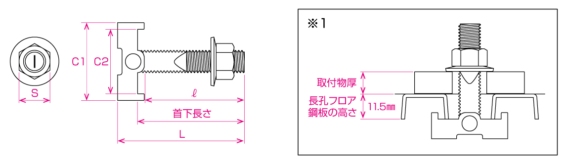 ※1 サイズ表の最大取付物厚は長孔フロア鋼板の高さが11.5mmの場合の寸法です。