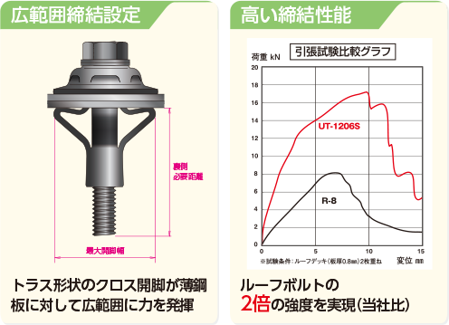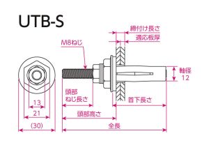| 軸径 | 品番 | 全長 | 頭部 | 首下長さ | 二面幅 | 下穴径 | 適応板厚 | 締付け長さ | 裏側 必要距離 | 最大 開脚幅 | 確認 トルク | 入数 | 標準価格 (税抜き) | ||
