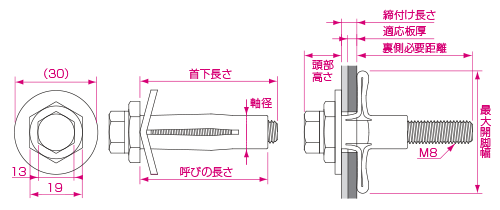 | 軸径 | 品番 | 頭部高さ | 首下長さ | 呼びの 長さ | 二面幅 | 下穴径 | 適応板厚 | 締付け長さ | 裏側 必要距離 | 最大 開脚幅 | 締付けトルク | 入数 | 標準価格 (税抜き) | |